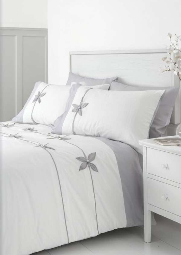 Ozdobne kokardki i rządy delikatnych zakładek w kontrastowej delikatnej szarości tworzą efekt 3D na piąknej, świeżej białej pościeli. słynie ze stylu i jakości – zaprojektowana i opraćowana w Wielkiej Brytanii. Pozyskane w Sposób etyczny za granicą i wyprodukowane zgodnie ze standardami jakości i bezpieczeństwa humanitarnego, zgodnie z MADE IN GREEN by OEKO-TEXą€®.