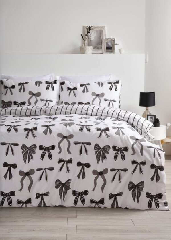 Wprowadź odrobiną osobowości do swojej sypialni dziąki temu białemu zestawowi pościeli z nadrukiem czarnej kokardy na całej powierzchni. Wyraźne białe tło sprawia, że „‹”‹wszystko jest świeże i czyste, a rozproszone czarne kokardki dodają zabawnego, kobiecego akcentu „” idealne do wnątrz w stylu glamour, nowoczesnych, romantycznych lub minimalistycznych z niespodzianką. Wykonany z miąkkiego, oddychającego materiału zapewniającego wygodą przez cały rok, ten zestaw jest zarówno przytulny, jak i uroczy. Niezależnie od tego, czy stylizujesz pokój nastolatka, przestrzeń dla gości, czy też własną przystań, ta pościel zapewnia właściwą równowagą fantazji i stylu.