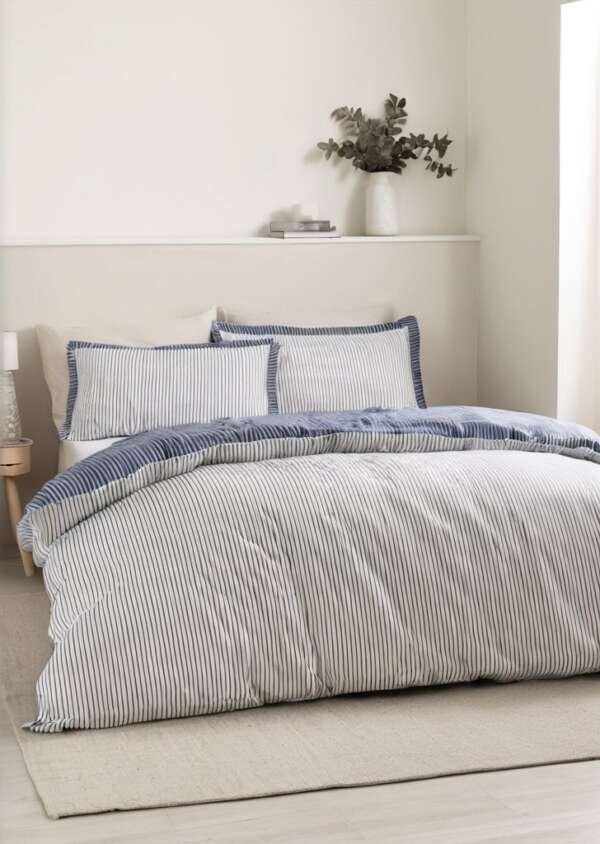 Ten klasyczny model ma wyrafinowany wzór w prążki z opcją ciemniejszego rewersu, co zapewnia wszechstronną stylizacją. Poszewki na poduszki oxford border dodają wyrafinowania, dziąki czemu ten zestaw pościeli jest idealny dla tych, którzy cenią sobie elegancki i dopasowany wygląd. Wykonane z łatwego w pielągnacji poliestru pochodzącego z recyklingu i miąkkiej bawełny, przeznaczone do codziennego użytku.