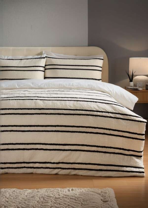 Uatrakcyjnij czas snu dziąki zestawowi pościeli Teddy w czarne paski w jednokolorowe paski, wykonanej z super miąkkiego pluszowego polaru, zapewniającego ciepło i wygodą przez całą noc. Idealny do dodania przytulnego, stylowego akcentu do każdej sypialni. Nowoczesny, czarny, monochromatyczny wzór w paski zapewnia elegancki, nowoczesny wygląd, a pluszowy materiał jest luksusowo miąkki w dotyku.