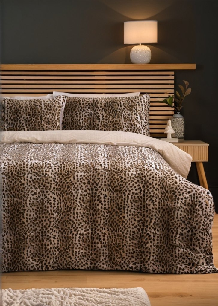 Zestaw pościeli ze sztucznego futra w kolorze brązowym w panterką